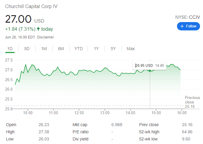 Update June 30: Anohter day another 10% despite no material new news emanating from the company the shares have surged so far this week as the official merger nears. It seemed a foregone conclusion but markets like certainty so this is perhaps behind the surge. CCIV shares closed Wednesday at $28.82 up just under 10%.