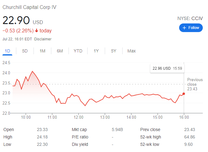 Update July 22: NYSE:CCIV ended Thursday in the red at $22.90, down 2.26% on a daily basis. American indexes struggled to post gains after the country posted softer-than-anticipated macroeconomic figures. Weekly unemployment claims unexpectedly jumped to 419K in the week ended July 16, spurring concerns about stalling economic progress. The NYSE Composite shed 38 points, although the three major indexes managed to post modest intraday gains.