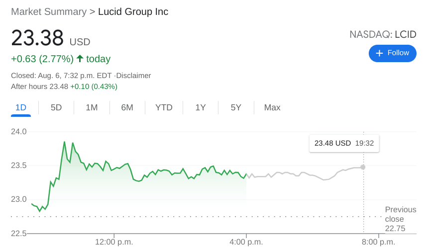 Update: LCID shares are trading another 2% higher on Tuesday as the sector is set to receive a boost from the infrastructure plan which is due for a vote before the US Senate on Tuesday. LCID is trading at $23.96 in the firt half hour on Tuesday as investors anticipate good news from the senate.