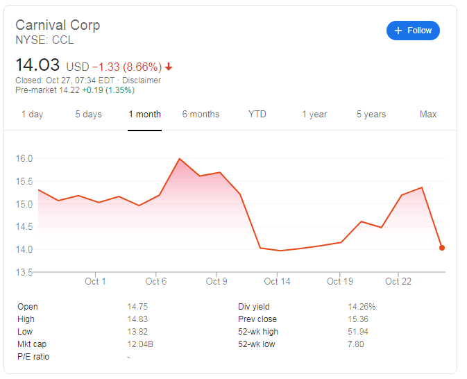 Carnival Corp (NYSE: CCL) fell by 8.66% on Monday, more than the broader stock market. It is now near the October lows. Further down, the round $10 level is eyed. Resistance is at $15.25, a recent high, followed by $16.