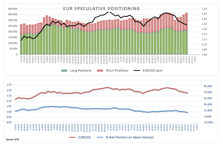 - Speculators added gross shorts to their EUR positions for the fourth consecutive week, taking the net longs to levels last seen in mid-March 2020, the onset of the coronavirus pandemic. Traders kept the outflows from the European currency running amidst the firm improvement in the sentiment around the dollar and in response to the potential impact on growth prospects of the increasing cases of the Delta variant of the coronavirus. EUR/USD, in the meantime met a tough barrier in the 1.1880/90 band during the past sessions.