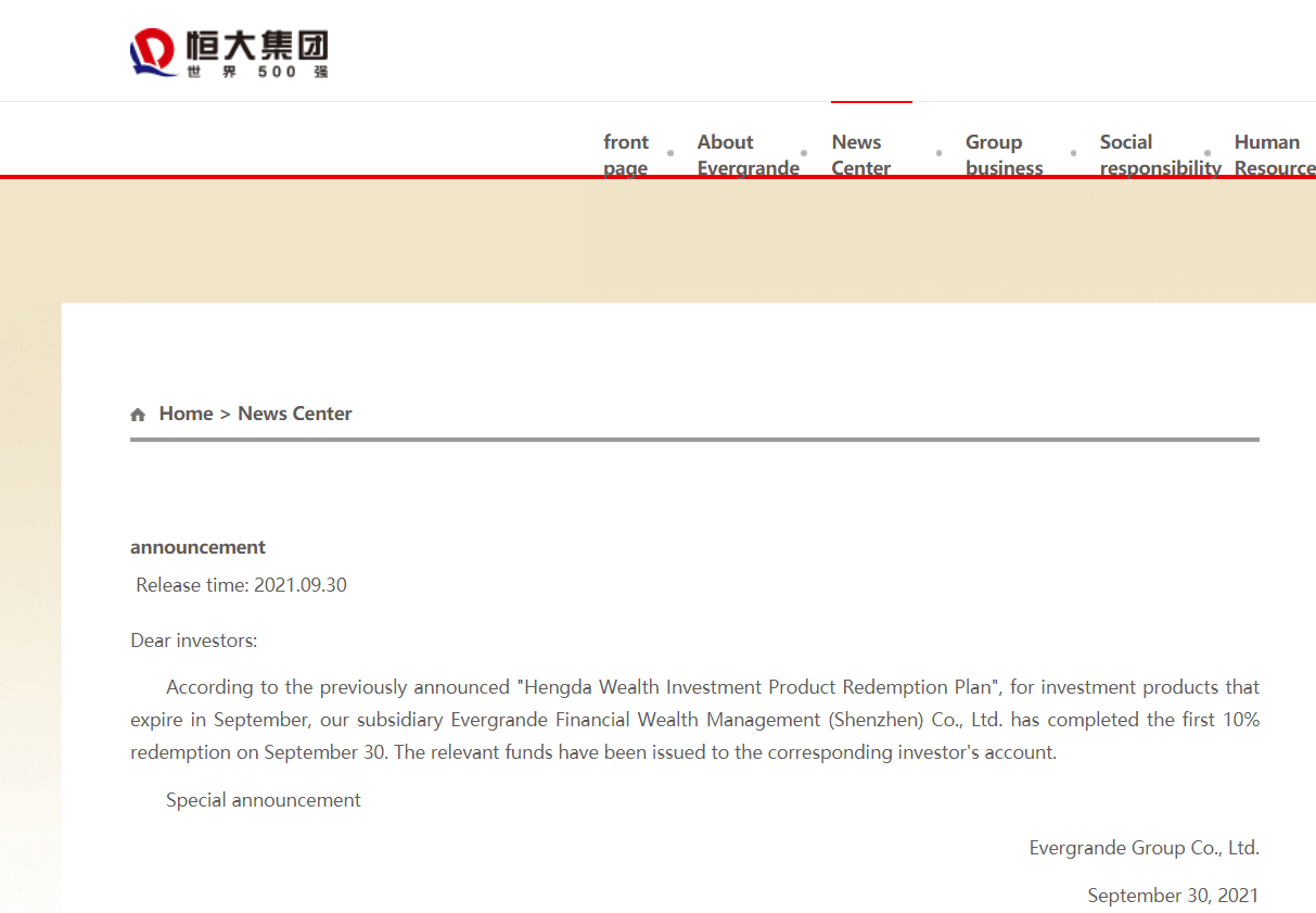 China Evergrande: Repaid 10% of wealth management products due in September