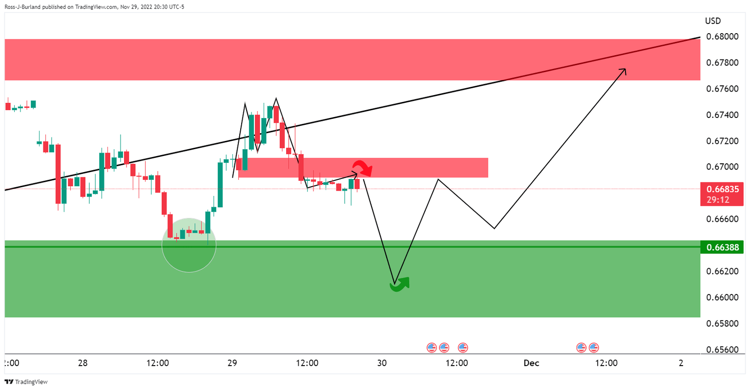However, the price is on the backside of the trend so there could be a phase of distribution to play out over the coming days between a wide 0.6800/ 0.6600 range for the parameters hold. While there is liquidity on either side of the range, the downside bias is in play while below 0.6700 resistance:
