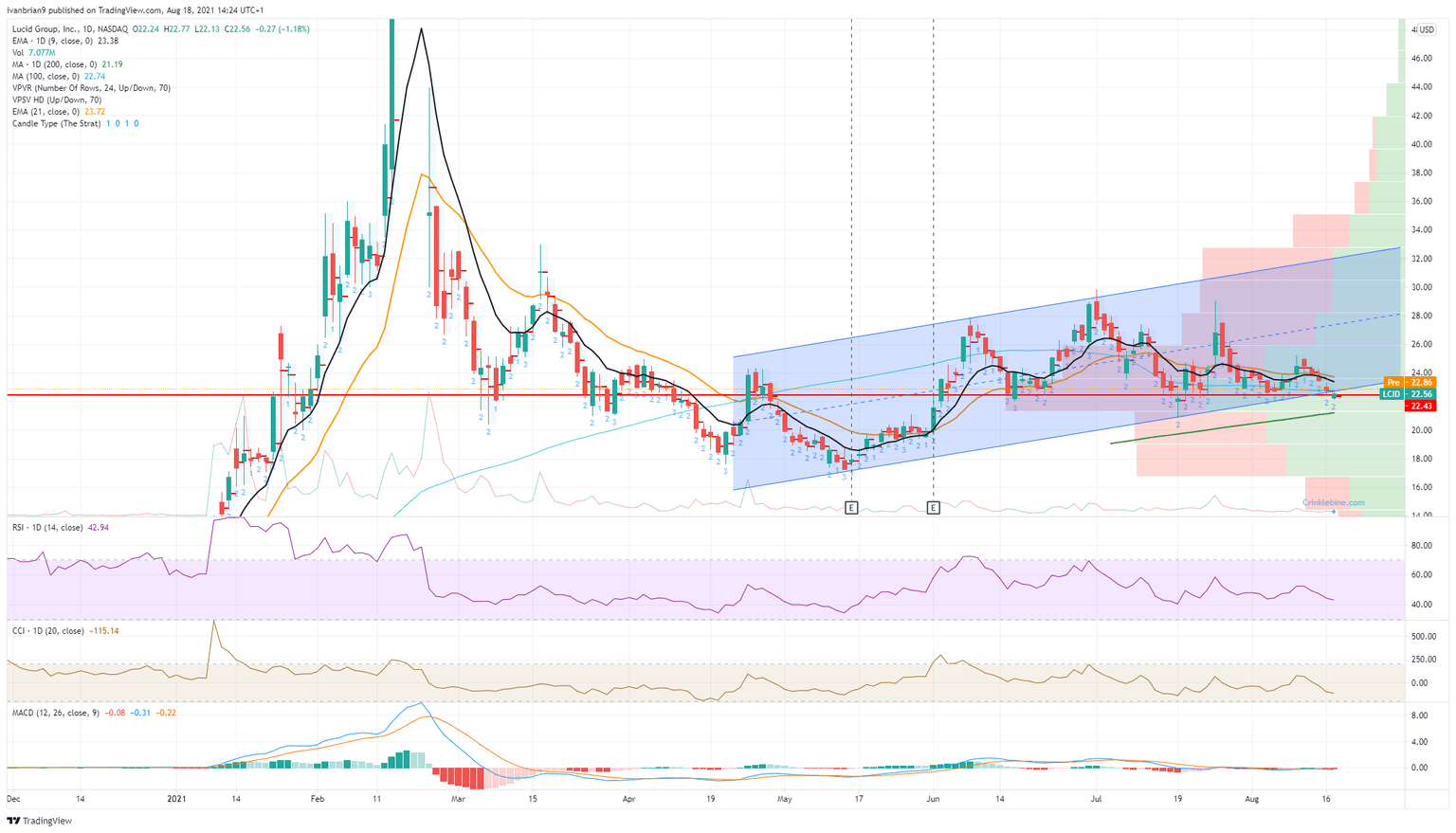 Lucid Group closed on Tuesday at $22.56, breaking out of the long term uptrend channel and in the process hitting the point of control at $22.43. The point of control is the price at which the highest volume has occurred – an equilibrium of sorts.