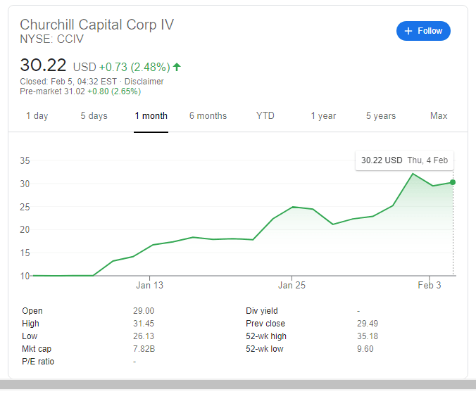 Update 2 Friday, February 5: Shares in CCIV continued to rally as Friday progressed. CCIV shares are trading above $35 at the time of writing, a gain of 16% for the day. Volume remains high in CCIV. Investors hoped that the rumoured merger between Lucid Motors and CCIV may be back on the cards.
