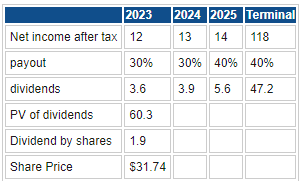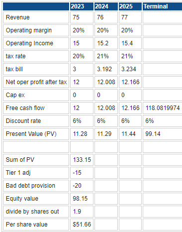 First, DCF models for banks are complicated by the treatment of debt, so we have simplified it. We have outlined our worst-case provision here with increased bad debt provisions based on a slowing economy. We have also taken into account the current Tier 1 capital adjustment and assumed that this may have to continue again based on a slowing economy in recession. The worst case in our view puts the price at around current levels, $51.66.