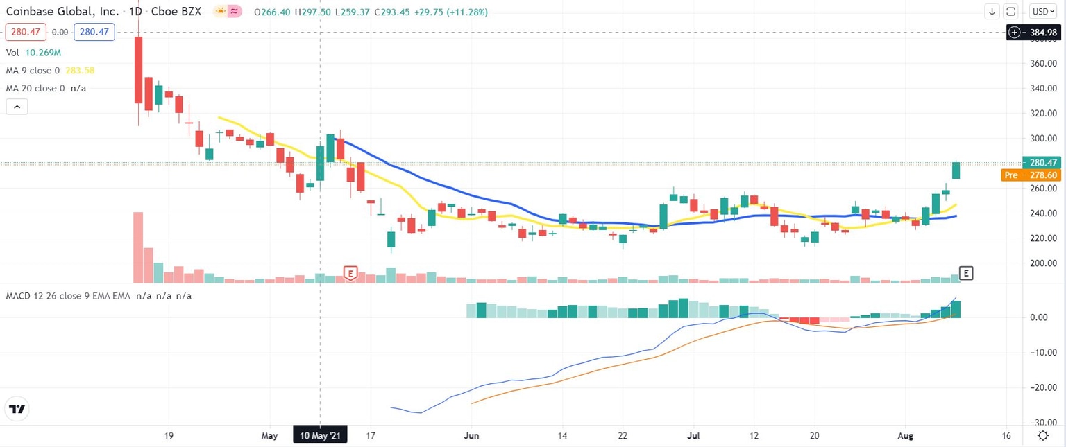 During Coinbase’s mid-April IPO, the stock briefly spiked to $429.54 before beginning its months-long crash to a low of $208. COIN stock developed a support zone between there and $216.71 over the subsequent two months but could not hold above $255. Last Friday, COIN blasted through the barrier for the first time since mid-May.