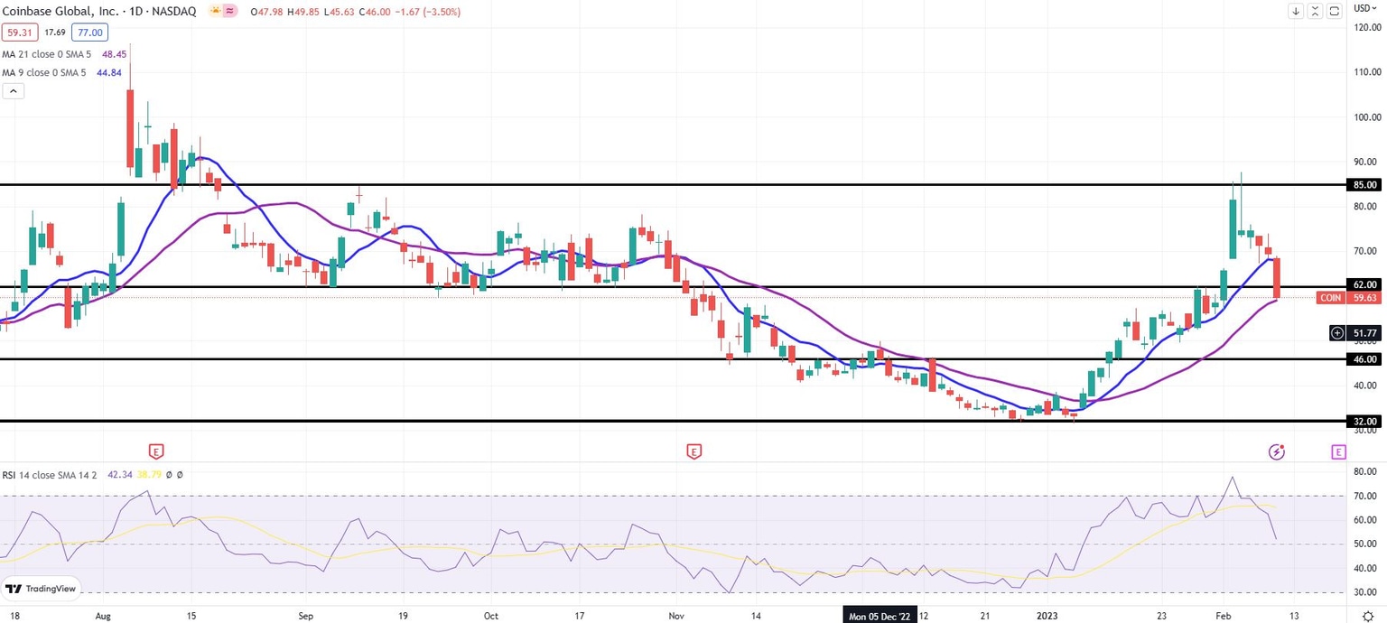 The third reason involves the macro picture. This week's equity market has turned lower as market participants have begun to understand that January's rally got out of hand. Federal Reserve Chair Powell's statements mid-week proved resonant for bulls who figured that interest rates were likely to come down soon. Instead, Powell said he expected rates to be high for some time to ensure a healthy price level equilibrium was reached. Russia's new offensive in Ukraine is also making February look unsafe for risk assets. For all of these reasons, expect COIN stock to fall back to $46 for support, which would entail a 22% decline from here.