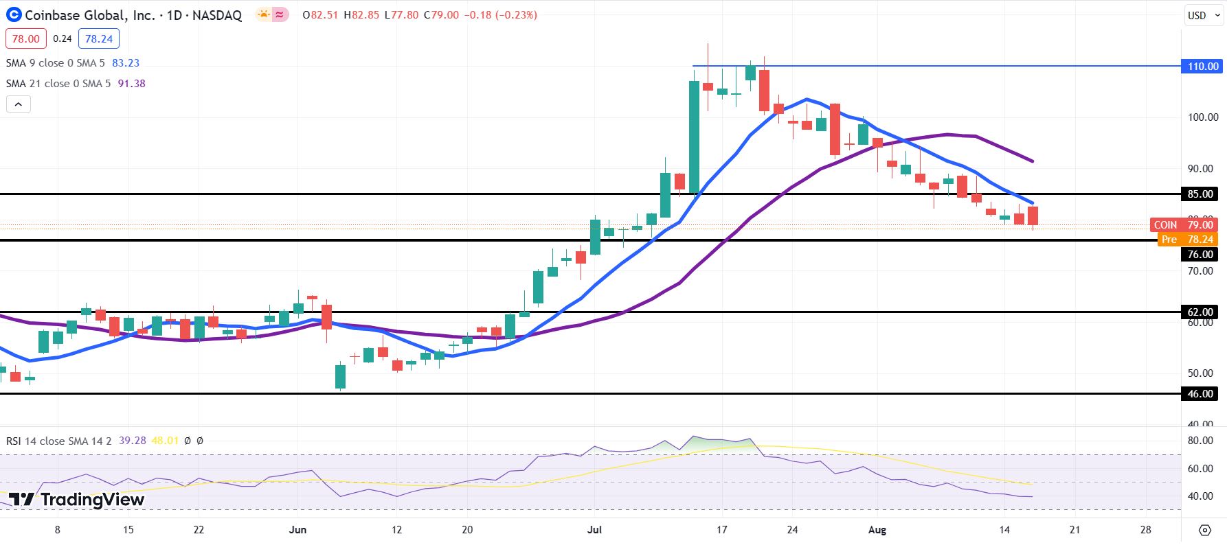 Coinbase stock has been trending lower since the July 14 range high at $114.43. On August 3, COIN’s 9-day Simple Moving Average (SMA) broke below its 21-day SMA counterpart, foreshadowing further downside movement.