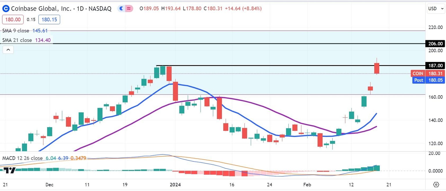 Coinbase stock overcame the prior resistance mark from the range high near $187 in Decemer 2023, two months ago. On Friday, COIN stock reached an intraday high of $193.64. This was the highest level that COIN stock has traded at since late March of 2022, nearly two years ago.