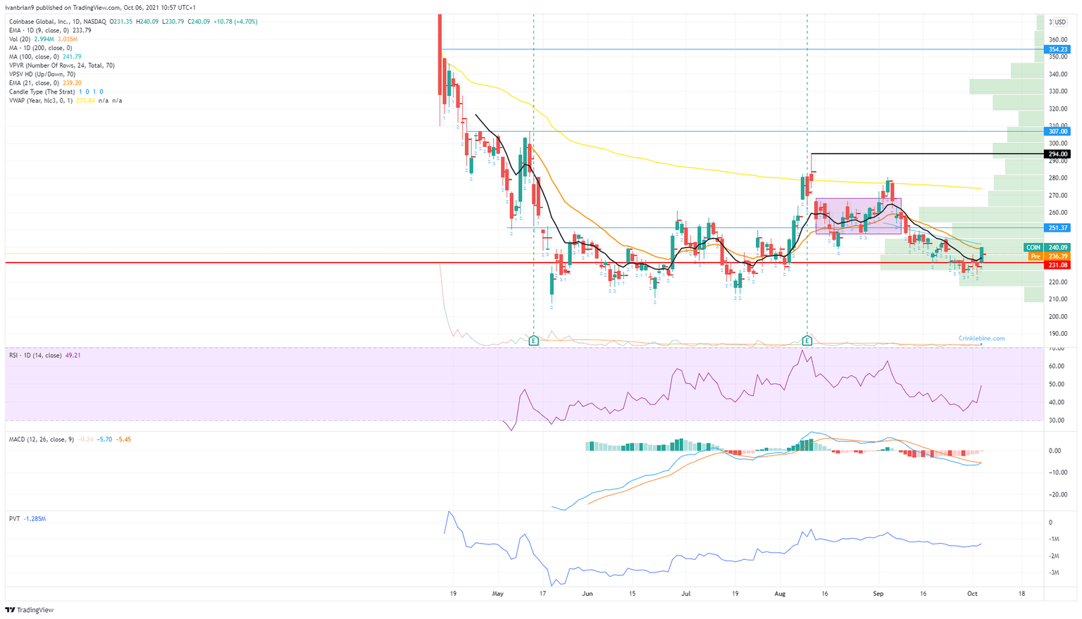 - COIN stock closes Tuesday nearly 5% higher at $240.09.