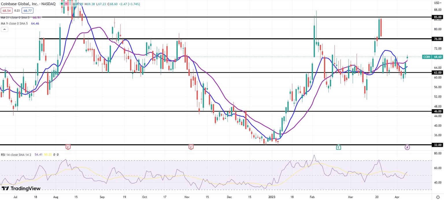 Coinbase (COIN) advanced another 3.2% to $68.25 at Tuesday's open on the back of Bitcoin (BTC) retaining its perch above $30,000. Bitcoin has leapt 6.6% in the past 24 hours to $30,135. The leading cryptocurrency began Monday around $28,400 before quickly breaking through the $30,000 market and putting in a high near $30,325 late in the day. COIN stock already rallied 7.6% on Monday.