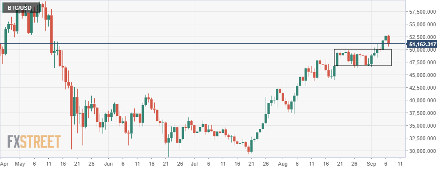 Crypto stocks are set to be back in focus once trading resumes after the long Labor Day weekend. The crypto king Bitcoin has finally broken back above $50,000 and held above there. El Salvador becomes the first country to officially have Bitcoin as its legal tender, so Bitcoin will definitely be in the headlines today. Below we can see the consolidation period followed by the eventual breakout, which looks to have been sustained.