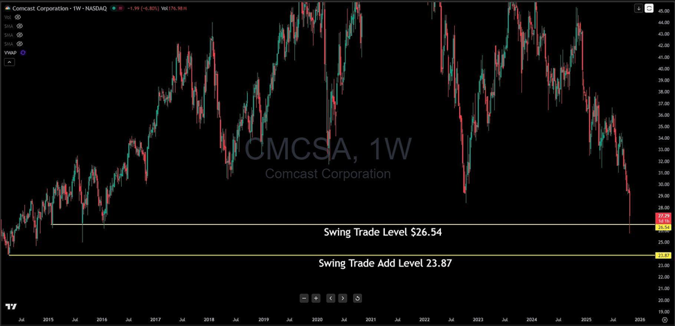 Comcast Corporation (CMCSA) is the media and telecommunications giant behind NBCUniversal and Xfinity services. The stock is approaching a technical inflection point that swing traders have been circling on their calendars. After a brutal descent from $45 earlier this year, the stock is now knocking on the door of a support zone that's held significance across multiple market cycles.