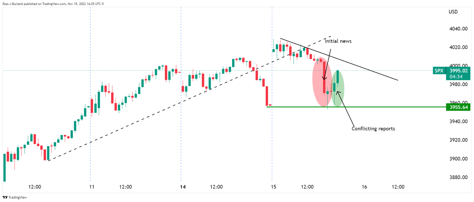 The stocks are rallying on the relief of the prospects that this is a false alarm. Nevertheless, markets will be on the lookout for the outcome of official confirmation from the Pentagon, Polish, and Hungarian defense committees. The S&P 500 is technically in the bearish territory while on the back side of the broken trendline and while below the resistance as per the drawings above. A close below 3,955 will be significantly bearish.