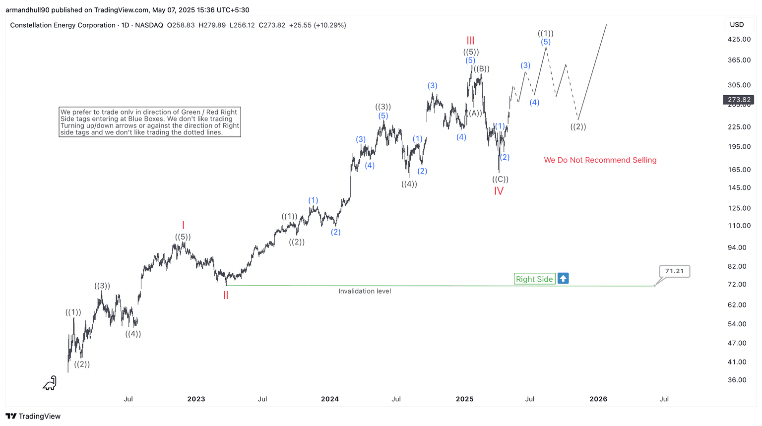 In summary, the wave IV correction is likely complete, and wave V has probably started. With a strong technical structure and bullish momentum, Constellation Energy remains a high-potential name to watch in the coming weeks and months.