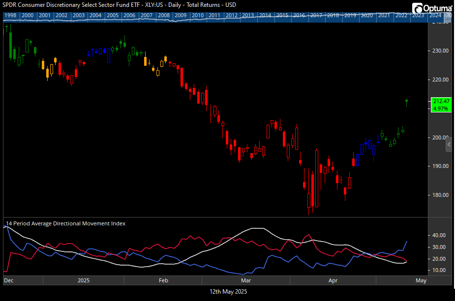 As for the YAY! Moment (today), the candles (RRG Trend) were already Green and Directional Movement had recently turned positive (Blue line is above Red). But in either case, the news that triggered these moves wasn’t expected. Today’s positive news about tariff negotiations could have gone bad in the same amount but in the other direction.