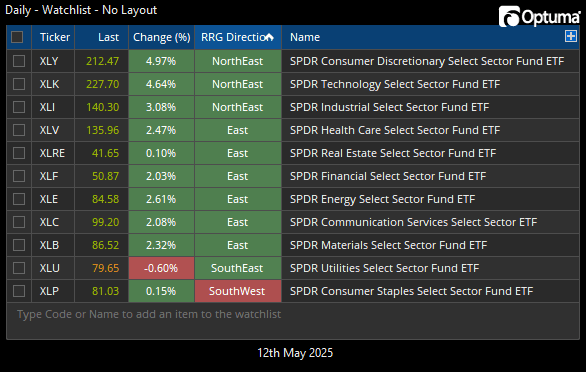 In Optuma, I have the current direction listed as a heading (RRG Direction) and colored Green or Red, depending on the current direction of each sector. (Not shown today, I also can have Blue or Orange if a sector is starting its transition from Green to Red or vice versa.)