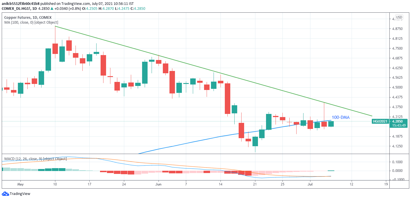Meanwhile, an upside break of the 100-DMA level of $4.2910 needs validation from a downward sloping trend line from May 10, near $4.3950, to back the bulls.
