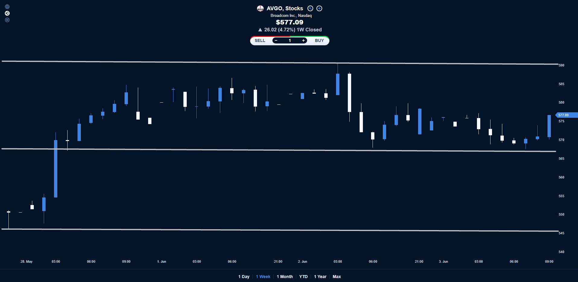 When we look at the AVGO ‘s chart, we can see the spike from the $550 level on the 28th of May to the $580 level and the consolidation at the same level. On the 1st of June it managed to reach as high as $590 but unable to move higher it returned to the $577 level forming support at the $568 level. During yesterday’s it mainly traded sideways and was last found trading at the $577 range.