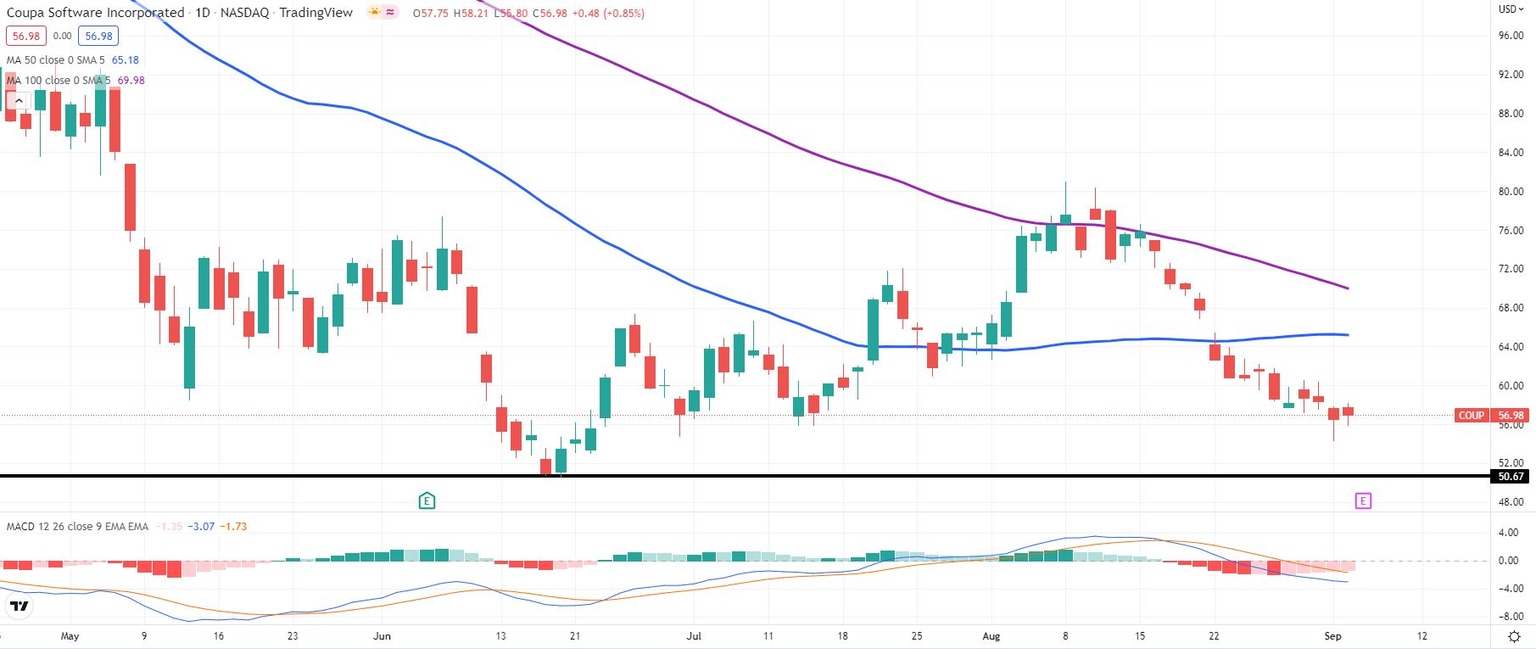 In the case of a likely beat, do not expect COUP to rebound all that much. The 50 and 100-day moving averages at $65 and $70, respectively, should hold any major excitement from getting out of hand. The Moving Average Convergence Divergence (MACD) also shows a downtrend.