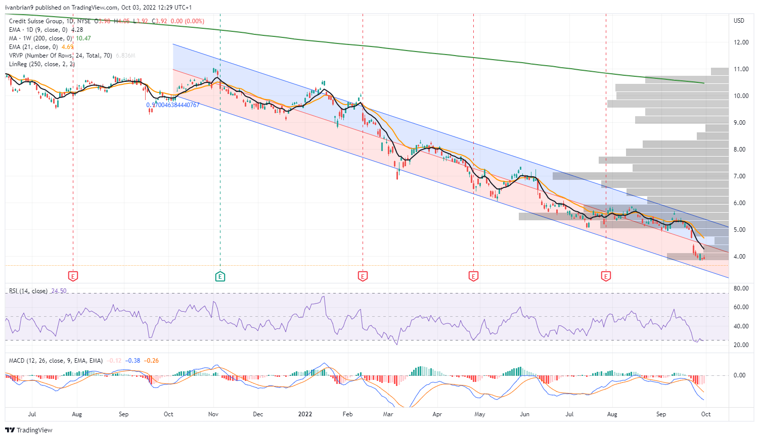UPDATE: Following an entire weekend of hot takes on Twitter that Credit Suisse would imminently go bust, CS stock has actually advanced 2.6% to $4.03 an hour into Monday's session. After falling as far as $3.70 in the first 15 minutes, Credit Suisse stock has spent the rest of the session so far climbing steadily. Over the weekend credit default swap spreads on the bank's bonds reached 250 basis points. Analysts at KBW estimated the bank would need to raise as much as $4 billion. The bounceback in the stock price may be due to the fact that the entire market has decided to turn a page after a dreadful September. As the first trading day in October, many pundits are talking up the possibility of a bear market rally. The Nasdaq is up 1.7% at the time of writing, while the Dow has advanced 2.1% and the S&P 500, 2%. Surprisingly, the Russell 2000 is up more than 2.2%. Due to a poor delivery figure released over the weekend, Tesla (TSLA) is the laggard. Shares are down 7%.