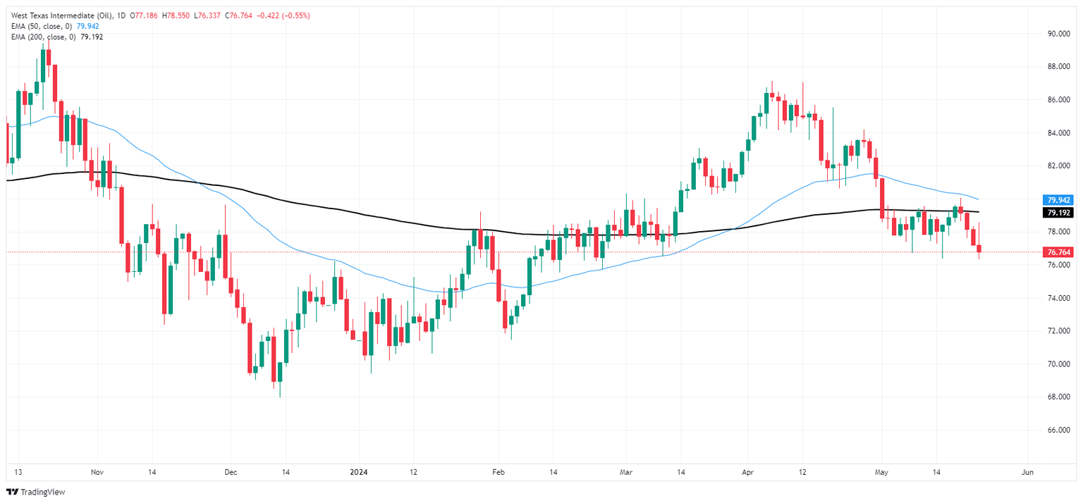 Crude Oil backslides into the red on Thursday, WTI falls below $77 as diminishing rate cut hopes weigh