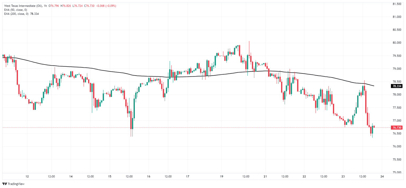 Crude Oil is sharply lower on Thursday, falling into negative territory after reaching an intraday peak with WTI testing $78.50. US Crude Oil has fallen to its lowest bids in over a week, knocking into $76.50 after backsliding through the $77.00 handle.