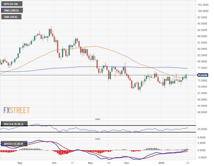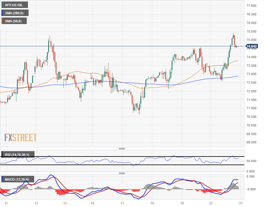 WTI climbed nearly 4% bottom-to-top on Monday, rising from $72.55 to test into $75.42, settling back into $74.64 as markets head into the Tuesday market session.