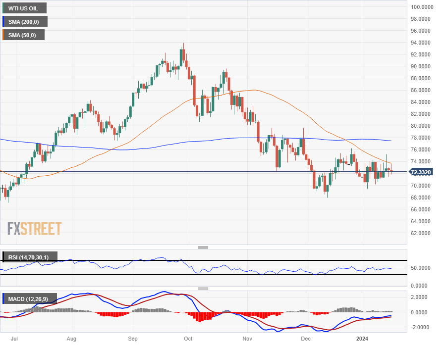 West Texas Intermediate (WTI) US Crude Oil roiled on Tuesday, trading into consolidation just above $72.00 per barrel as geopolitical concerns surrounding ongoing Houthi attacks on civilian cargo ships in the Red Sea continues to prop up barrel bids in fearful, uneven market action.