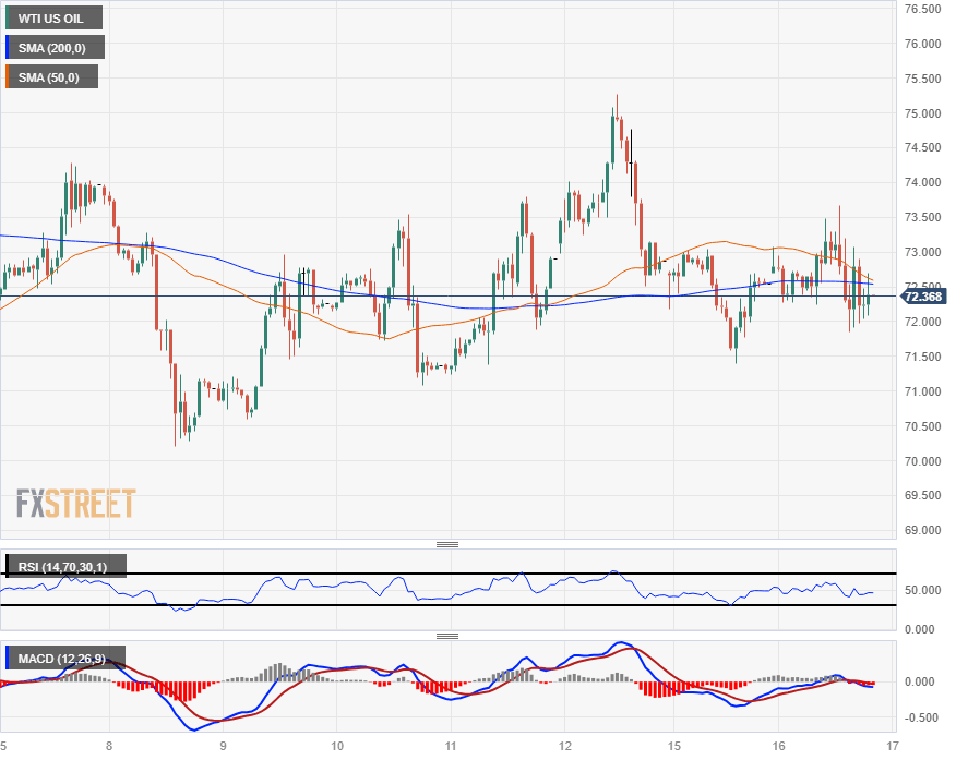 WTI US Crude Oil continues to trade into the midrange around the 200-hour Simple Moving Average (SMA) near $72.50 as barrel bids continue to shuffle around key levels, looking for a definitive push in either direction.