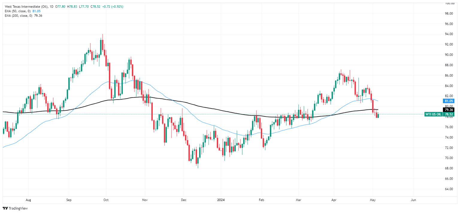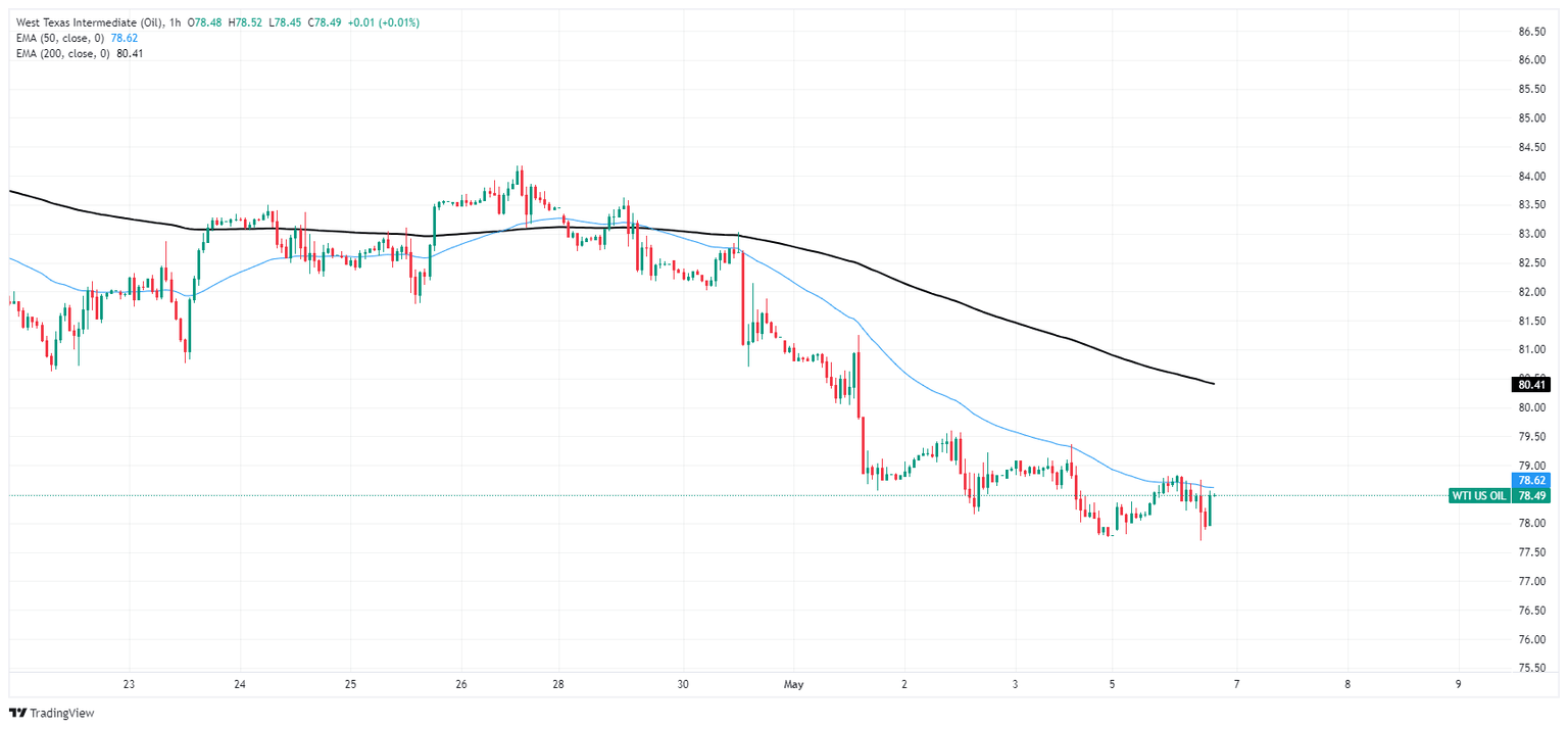 Recent bearish sentiment in Crude Oil has sent WTI further down from the 200-hour Exponential Moving Average (EMA) at $80.43, and US Crude Oil prices are down 3% in May.