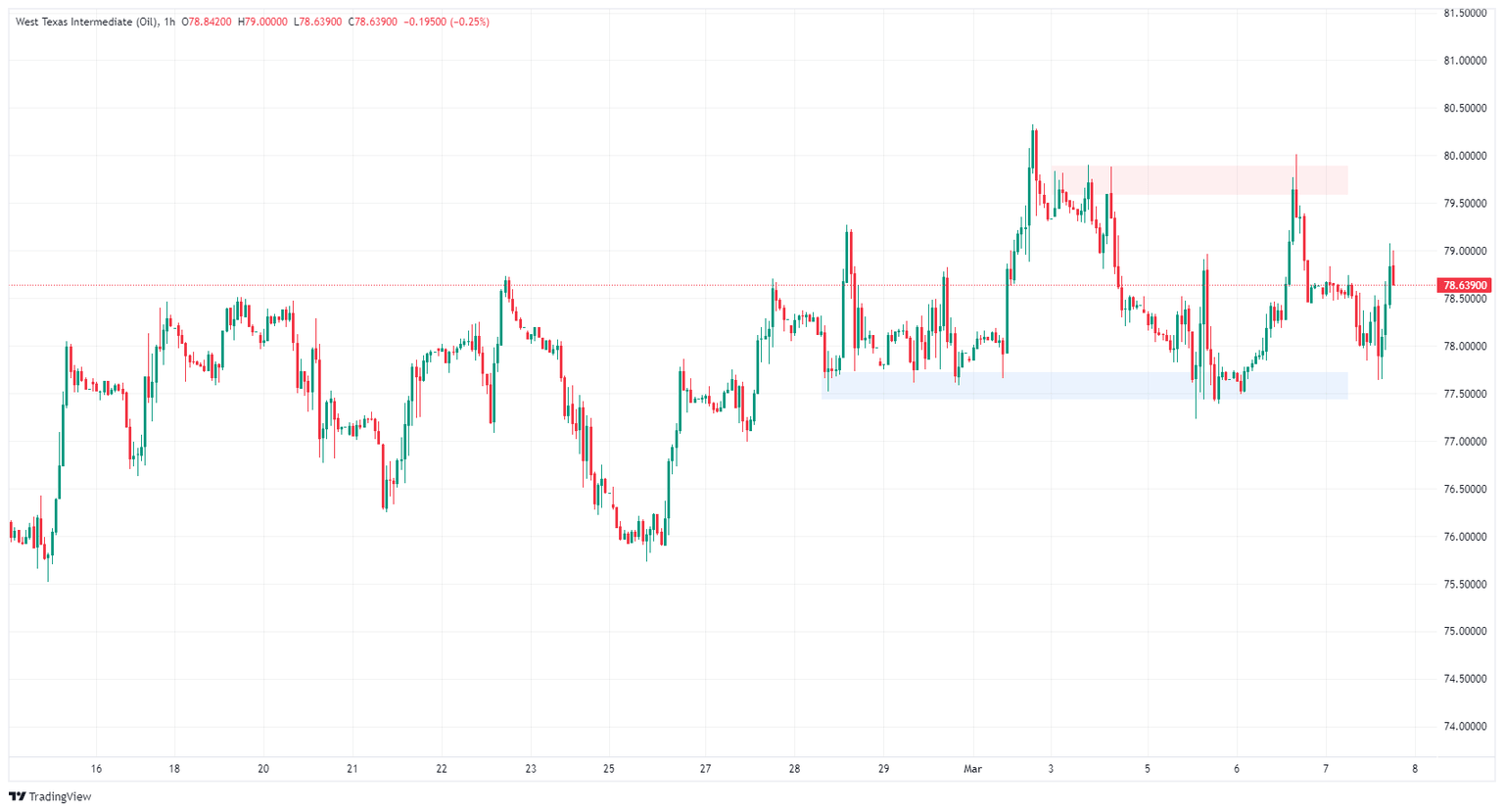 Daily candlesticks are stuck in a close pattern with the 200-day Simple Moving Average (SMA) near $77.90. US Crude Oil has risen around 10% from early February’s swing low into $71.50, but further topside moment has drained out of WTI.