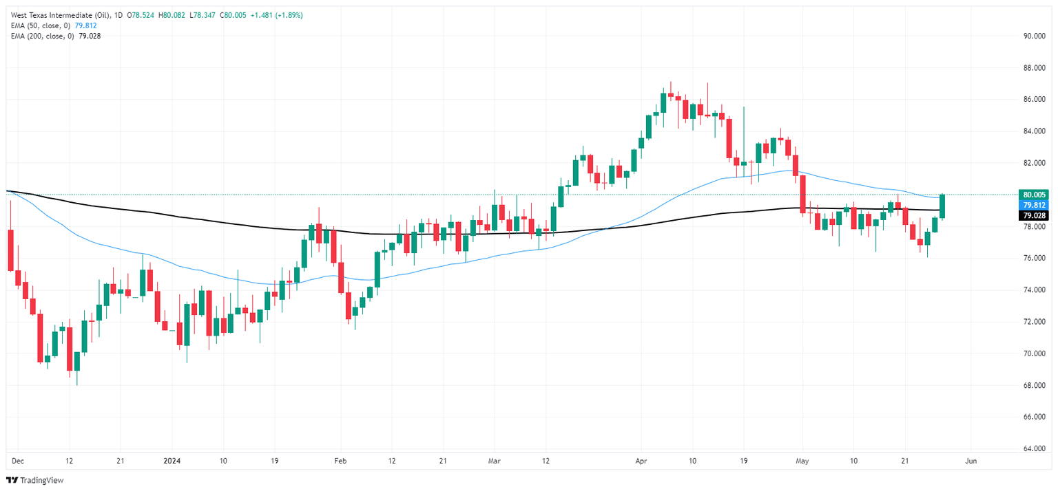 WTI US Crude Oil climbed over 5% from the last swing low into $76.00 per barrel, cracking $80.00 and climbing over $1.50 per barrel on Tuesday. WTI is testing into last week’s high bids and a near-term consolidation pattern is threatening to harden into the charts.