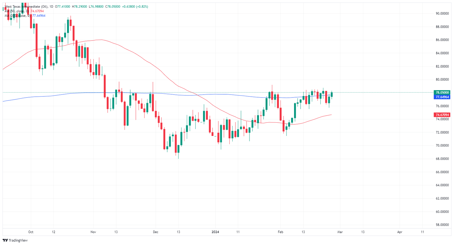 WTI remains mired in the 200-day Simple Moving Average (SMA) near $77.65, and near-term bullish momentum remains capped below January’s late peak at $79.20.