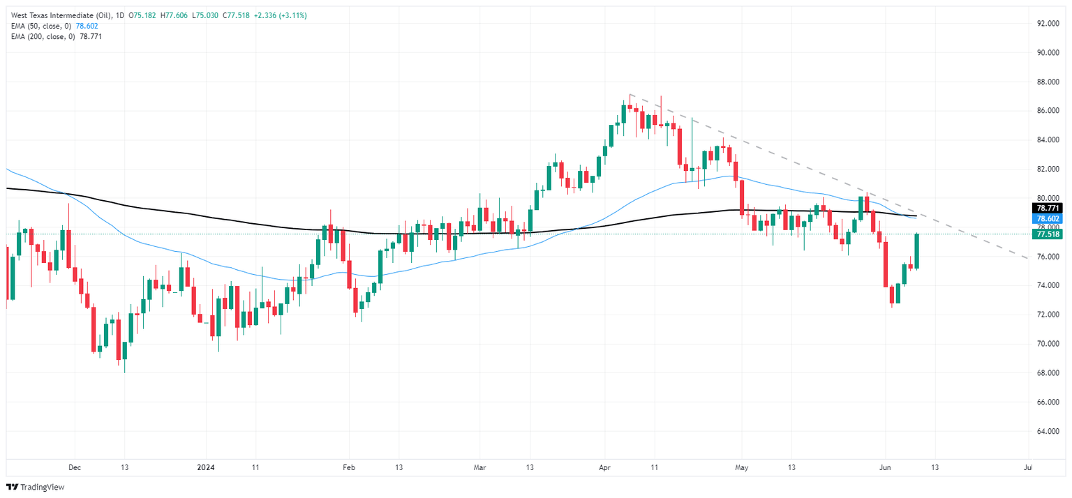 US Crude Oil is up over 3% on Monday, seeing its best single-day performance since early January as WTI bids cross back over $77.50 per barrel. Price action still remains on the low side of the 200-day Exponential Moving Average (EMA) at $78.76, but remains up 8.6% in 2024.