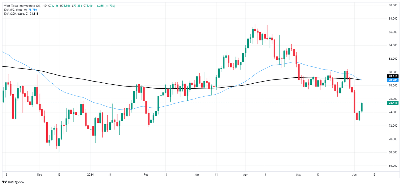 West Texas Intermediate (WTI) US Crude Oil recovered to $75.50 per barrel in thin market trading on Thursday, regaining recently-lost ground as energy traders try to shake off looming oversupply threats to focus on rising hopes of a Federal Reserve (Fed) rate cut in the third quarter.