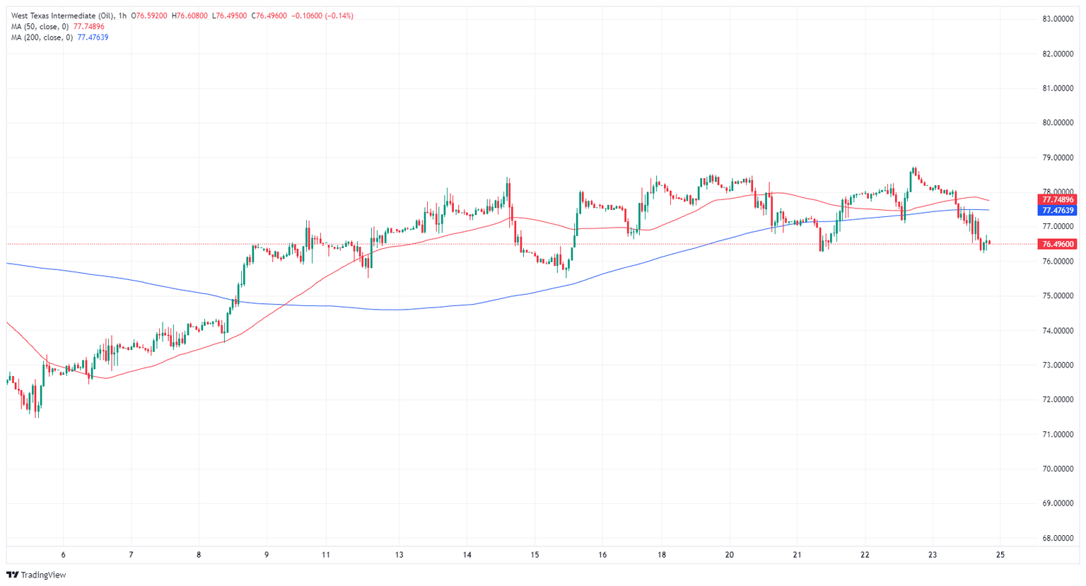 WTI fell back below the 200-hour Simple Moving Average (SMA) at $77.47 for the third time in a week as bullish momentum continues to evaporate. US Crude Oil is building out a rough consolidation pattern in the near-term, with a technical resistance zone marked in just below $79.00.