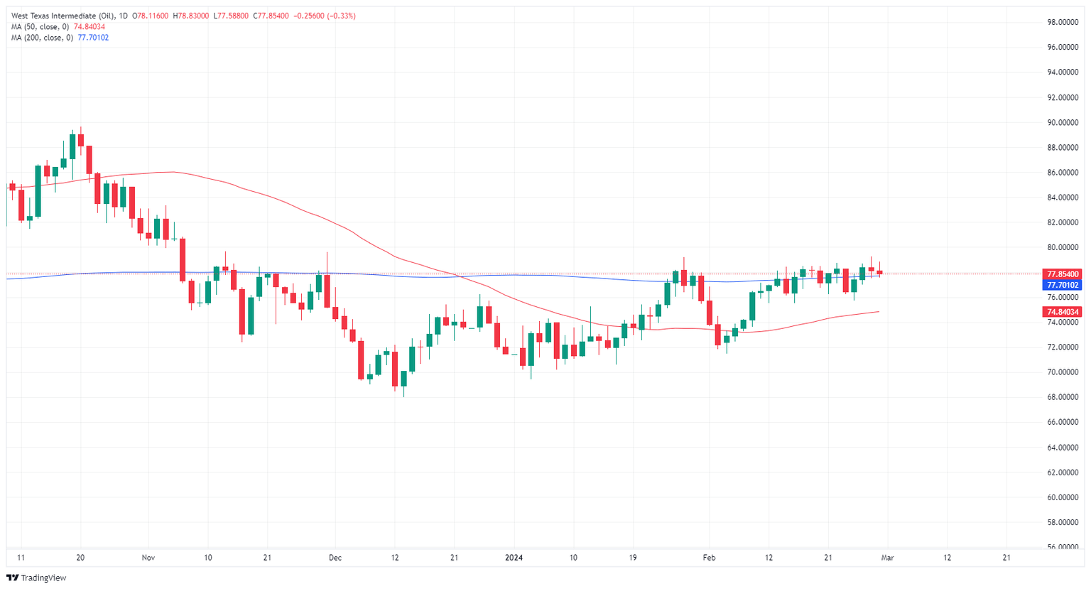 West Texas Intermediate (WTI) US Crude Oil traded closely with the $78.00 handle on Thursday as bullish Crude Oil momentum stopped in its tracks as rising US Crude Oil stocks begin to weigh on energy risk appetite. US Personal Consumption Expenditure (PCE) inflation came in at expectations but failed to spark renewed hopes for Federal Reserve (Fed) rate cuts.
