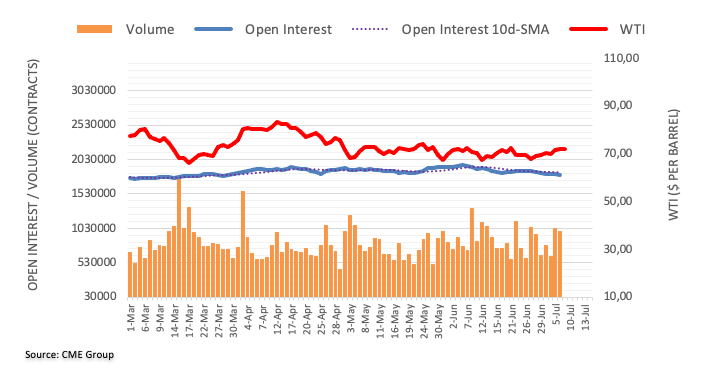 Thursday’s continuation of the weekly recovery in prices of WTI was against the backdrop of shrinking open interest and volume, which removes strength from further gains in the very near term. So far, the immediate target on the upside remains at the weekly high near $72.70 (June 21).