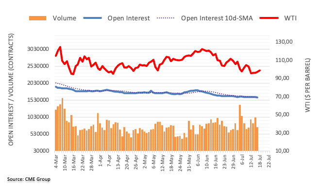 Friday’s rebound in prices of the WTI was amidst declining open interest and volume, which is indicative that the continuation of the bull run could be temporary. Immediately to the upside for crude oil, in the meantime, emerges the key $100.00 mark per barrel.
