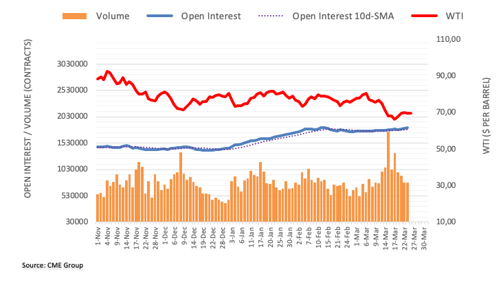Prices of the WTI approached the $72.00 mark per barrel on Thursday before ending the session with modest losses below $70.00. the negative price action was accompanied by rising open interest, which is supportive of the view that further decline lies ahead for the commodity in the very near term. That said, the next support of note emerges at the 2023 low near the $64.00 mark (March 20).