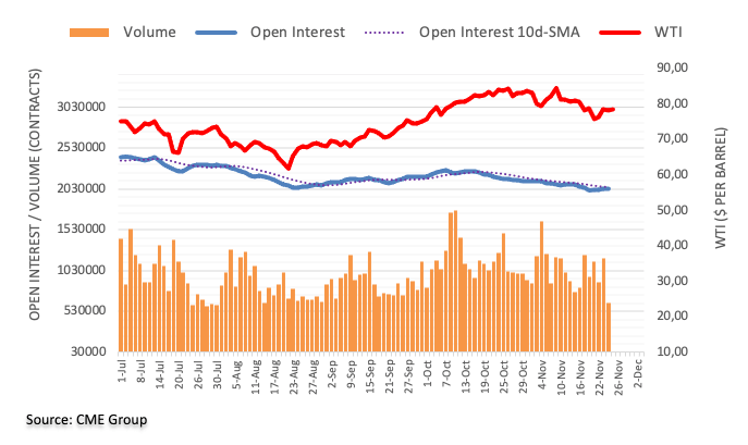 Crude oil prices charted an inconclusive session midweek amidst rising open interest and a marked drop in volume. Against this, it appears that extra range bound remains on the table for WTI in the very near term, with intermittent bullish attempts still targeting the key $80.00 mark per barrel.