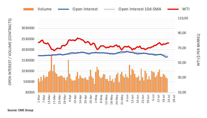 Open interest in crude oil futures markets increased by around 13.5K contracts after four consecutive daily pullbacks on Friday according to preliminary readings from CME Group. Volume, instead, shrank for the third straight session, this time by nearly 50K contracts.