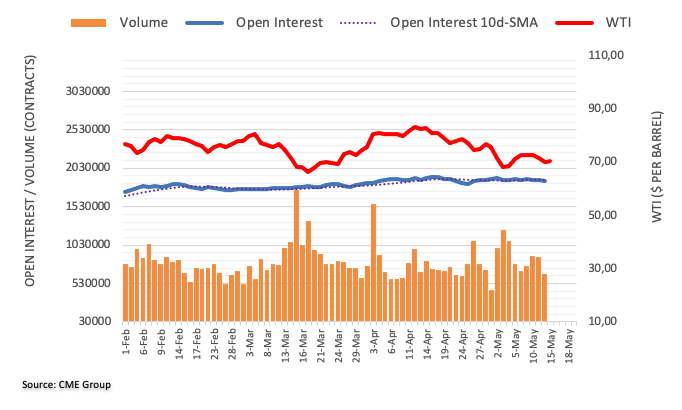 Prices of the barrel of the WTI dropped for the third session in a row at the end of last week. The downtick, however, was on the back of declining open interest and volume and is suggestive that further retracements appear out of table in the very near term. Occasional bullish attempts should face initial hurdle at the weekly high of $73.83 (May 10).
