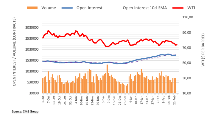 Wednesday’s strong retracement in prices of the WTI came amidst rising open interest and volume and is suggestive that extra weakness could emerge on the horizon in the very near term. Against that, the next support level of relevance is seen at the 2023 low at $72.30 per barrel (February 6).