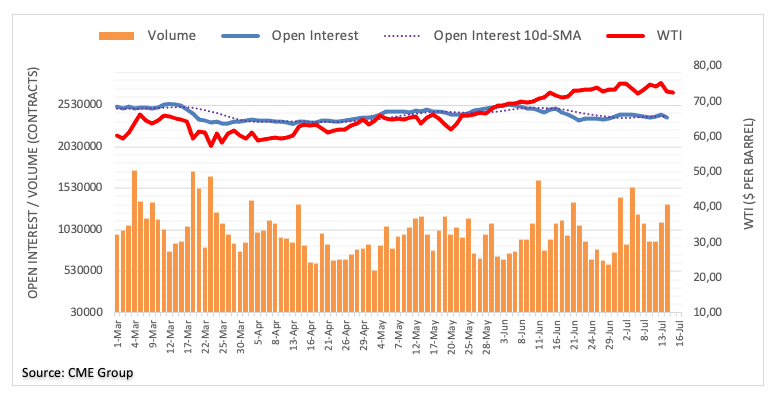 Wednesday’s negative price action in the WTI was amidst shrinking open interest, leaving the prospects for further downside somewhat curtailed for the time being. That said, crude oil is seen facing the immediate support around monthly lows near the $71.00 mark per barrel.