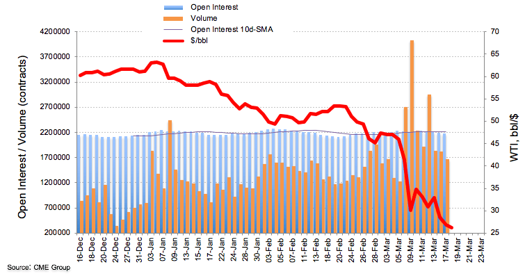 Prices of the barrel of WTI remain well entrenched into the negative territory and are now challenging the $26.00 mark. However, decreasing open interest and volume should allow for some rebound in the near-term, helped by the ongoing extreme oversold condition of the commodity.