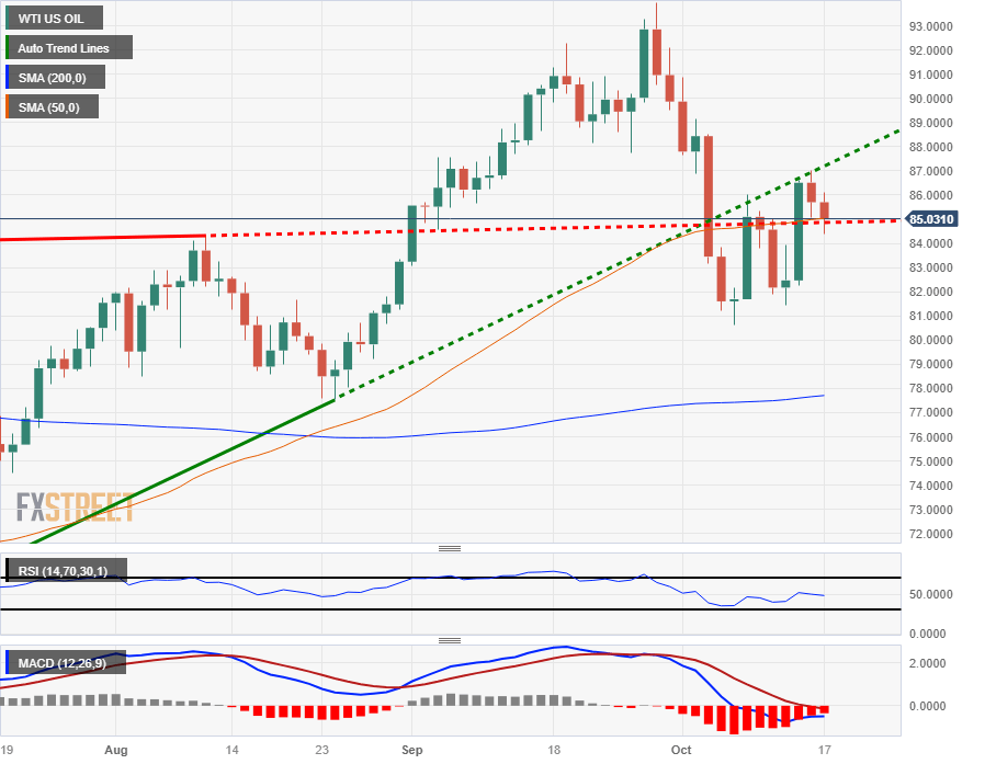 Intraday action on the WTI chart is getting capped off by the 50-hour Simple Moving Average (SMA) near $85.75 as Crude Oil prices struggle to regain last week's late swing into the $87.00 handle, and Tuesday's early push into $86.00 proved to be short-lived as WTI Crude Oil barrels get stuck to the $85.00 level.