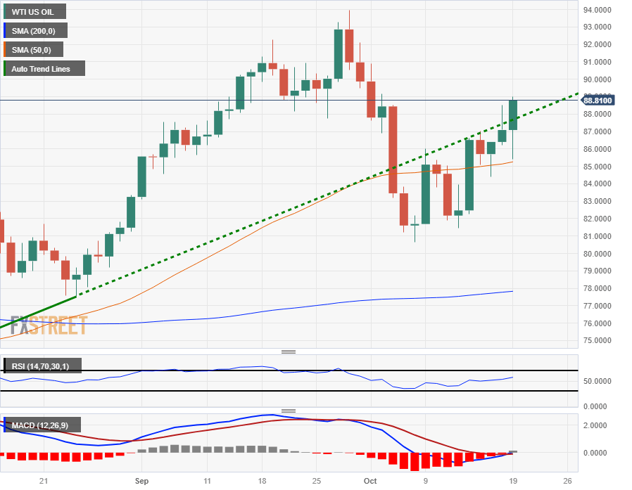 West Texas Intermediary (WTI) barrel prices are getting pushed back into recent highs for Thursday, rising into $88.30 per barrel after kicking the day off with an early decline into $85.50.